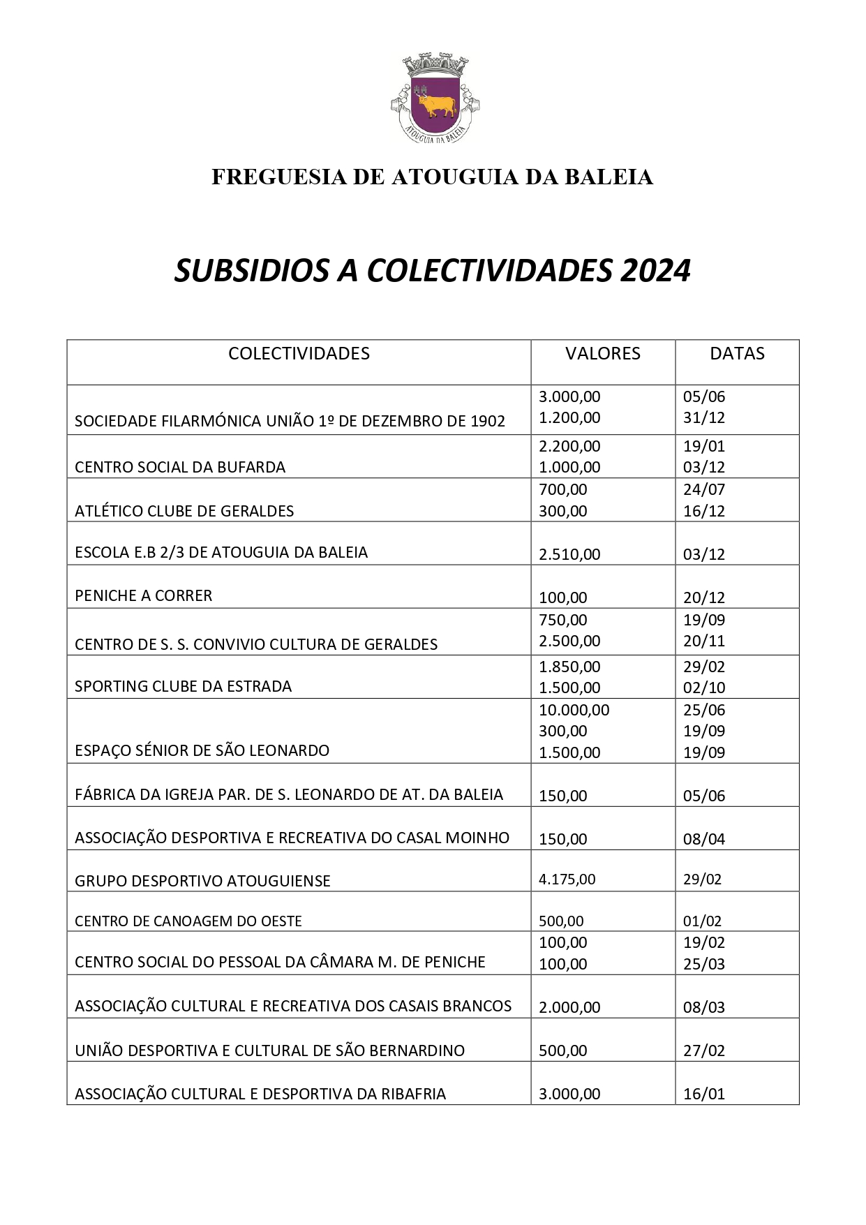 Publicam-se os valores atribuídos às coletividades do concelho durante o ano 2024 Clique para ver o ficheiro: