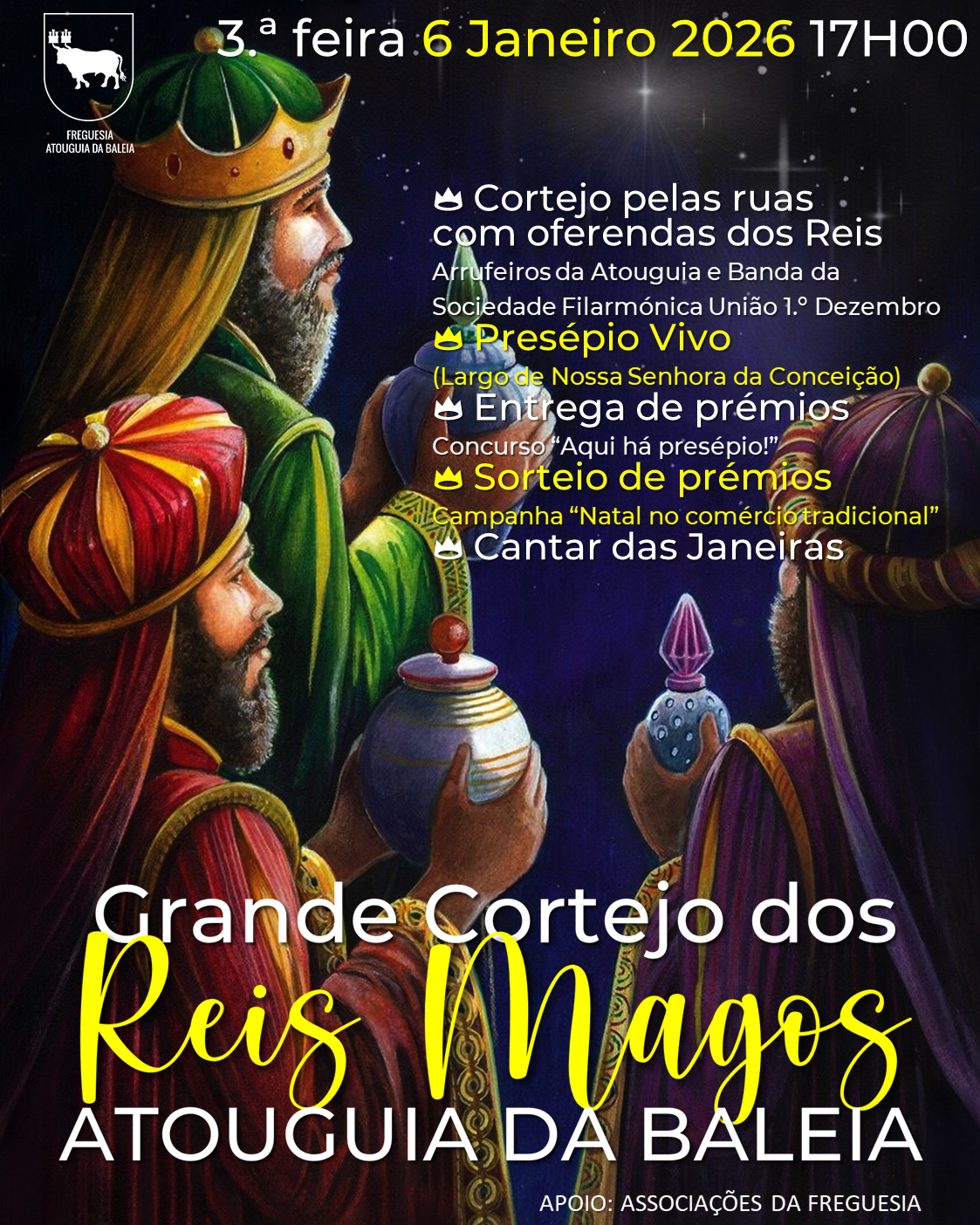 Está quase a chegar o Grande Cortejo dos Reis Magos! Terça-feira, 6 Janeiro 2026, a partir das 17h00, Suas Majestades os Reis Magos vão percorrer as ruas da nossa vila com muita animação e terminando com um Presépio vivo e com o Cantar das Janeiras, com os coros e associações da nossa freguesia, no Largo de Nossa Senhora da Conceição. Com a participação dos Arrufeiros da Atouguia e da Banda da Sociedade Filarmónica União 1.º Dezembro.