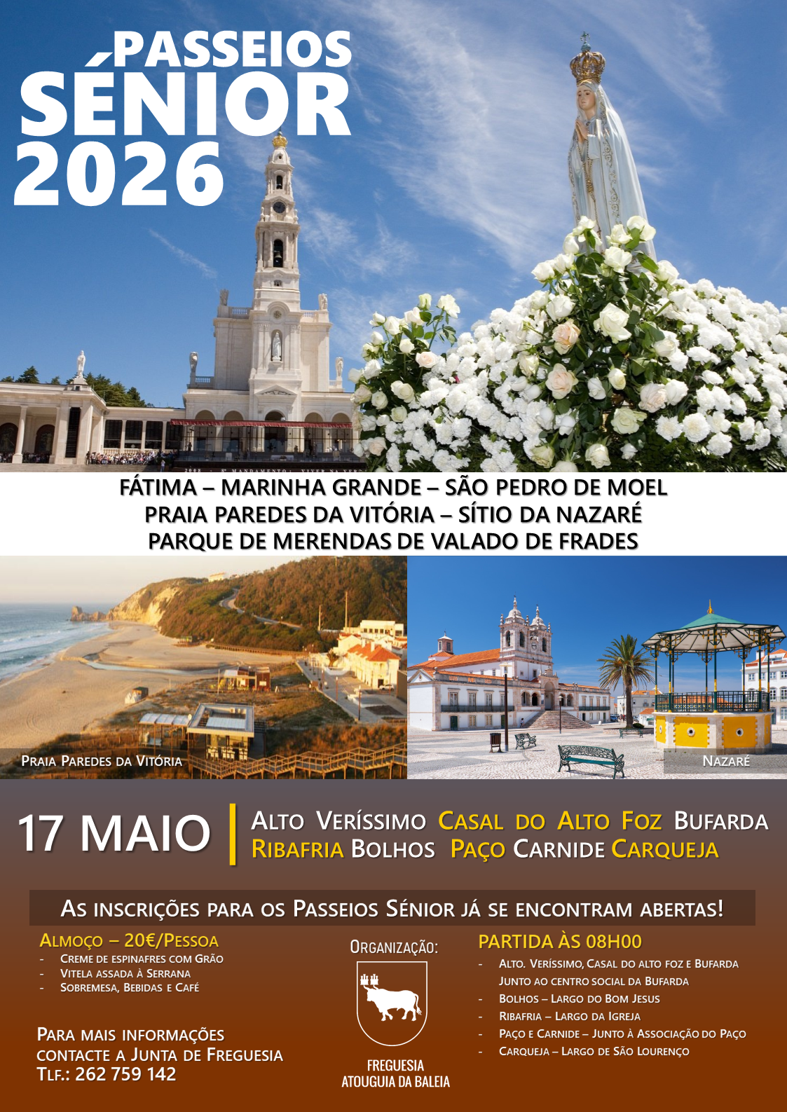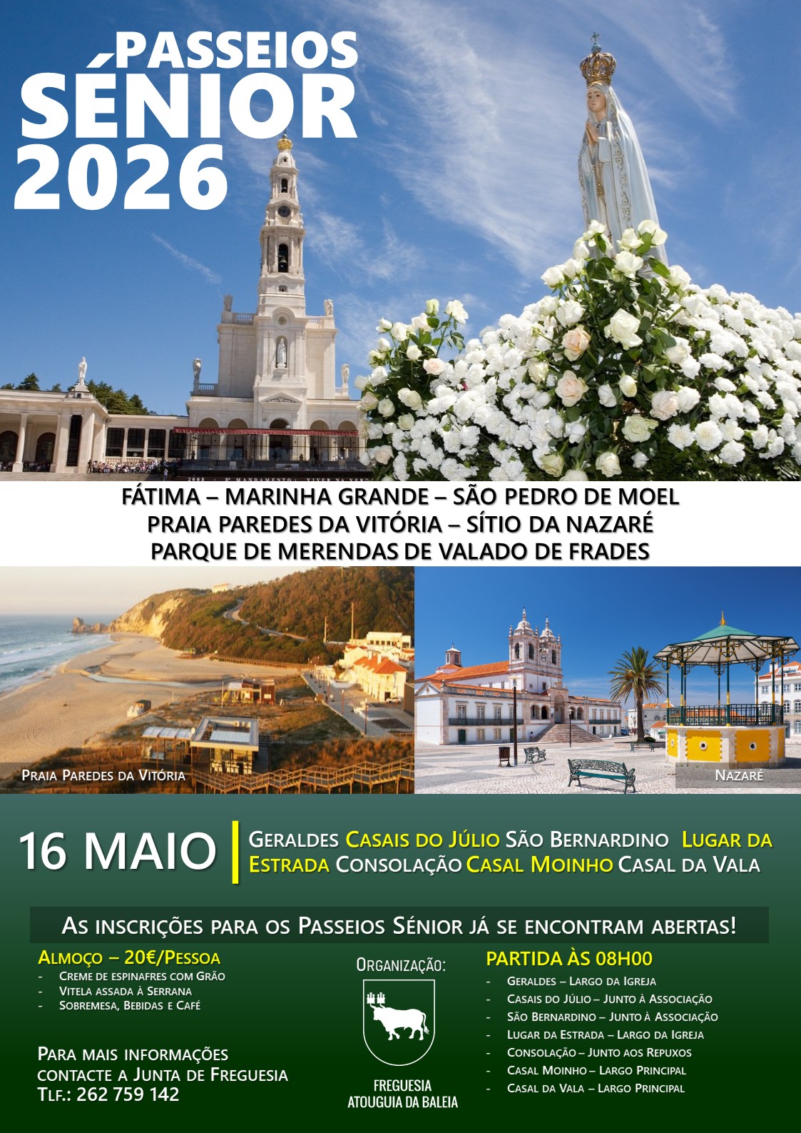 A Junta de Freguesia de Atouguia da Baleia vai mais uma vez organizar os Passeios Sénior para dar oportunidade às pessoas para que após uma vida dedicada ao trabalho tenham agora oportunidade de usufruir de momentos de convívio e de lazer. Este ano iremos Visitar Fátima, Praia Paredes da Vitória e Nazaré!