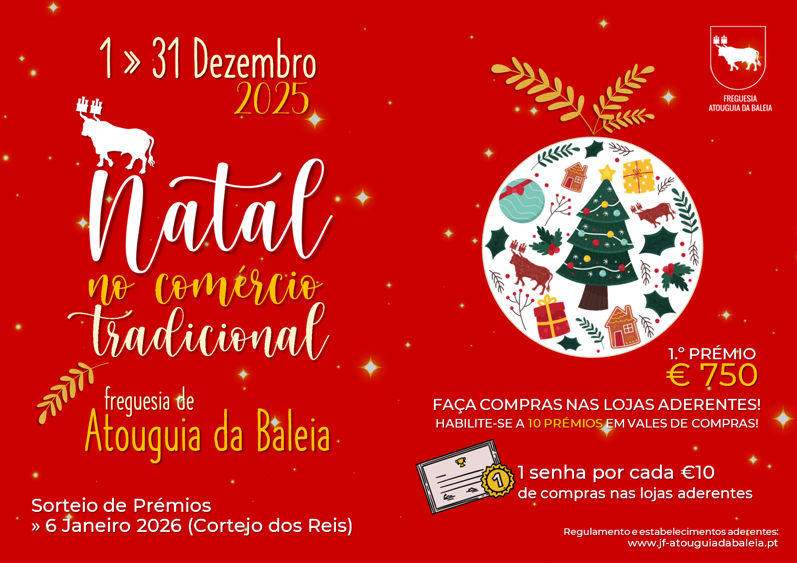 A Junta de Freguesia de Atouguia da Baleia organiza a 2ª edição da campanha de apoio ao comércio tradicional da freguesia para a época natalícia, designada “Natal no Comércio Tradicional”, que decorre de 1 a 31 de Dezembro de 2025.