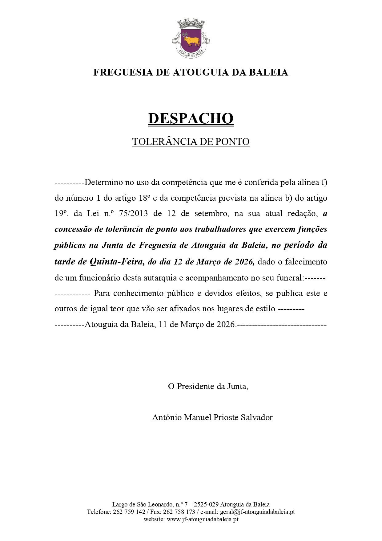Concessão de tolerância de ponto aos trabalhadores que exercem funções públicas na Junta de Freguesia de Atouguia da Baleia, no período da tarde de Quinta-Feira, do dia 12 de Março de 2026, dado o falecimento de um funcionário desta autarquia e acompanhamento no seu funeral.