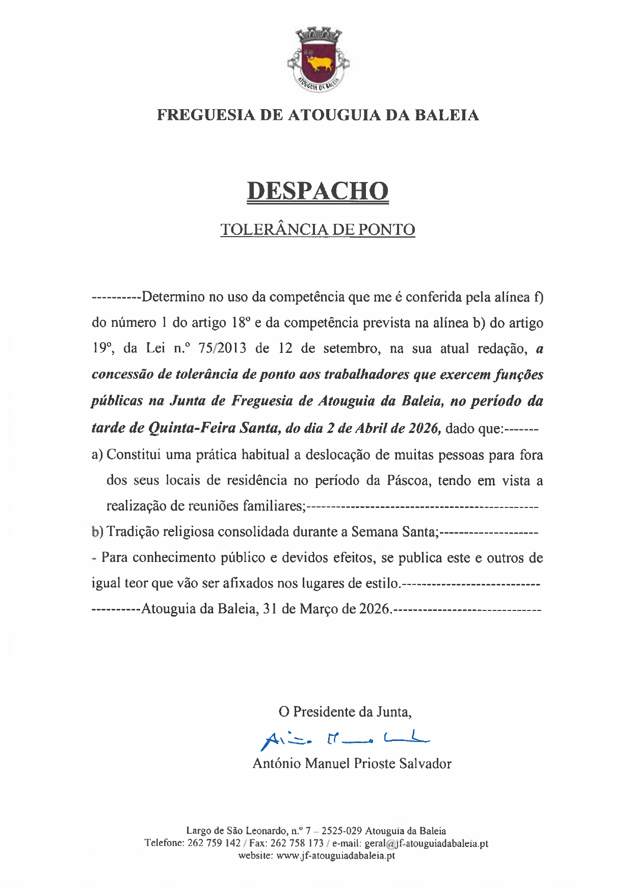 Concessão de tolerância de ponto aos trabalhadores que exercem funções públicas na Junta de Freguesia de Atouguia da Baleia, no período da tarde de Quinta-Feira Santa, do dia 2 de Abril de 2026.